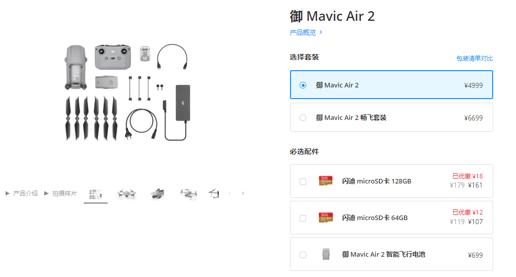 即日起,大疆 Mavic Air 2 在中国大陆地区现货发售。大疆官方商城、京东、天猫及深圳、上海、南京、杭州旗舰店和线下授权体验店开始同步现货发售。御 Mavic Air 2 标准版含飞行器、1 块电池、遥控器等配件,售价 4,999 元,畅飞套装另含单肩包,2 块备用电池、1组ND滤镜等配件,售价 6,699 元。大疆Mavic Air 2的DJI Care随心换保障计划售价 499 元。