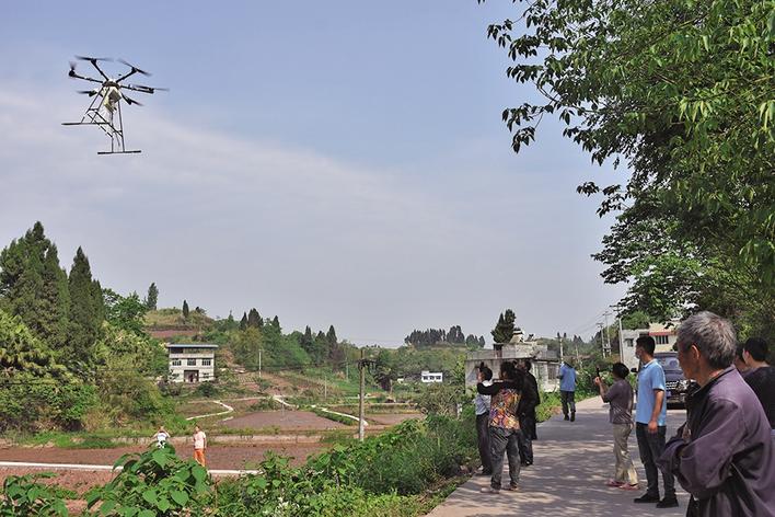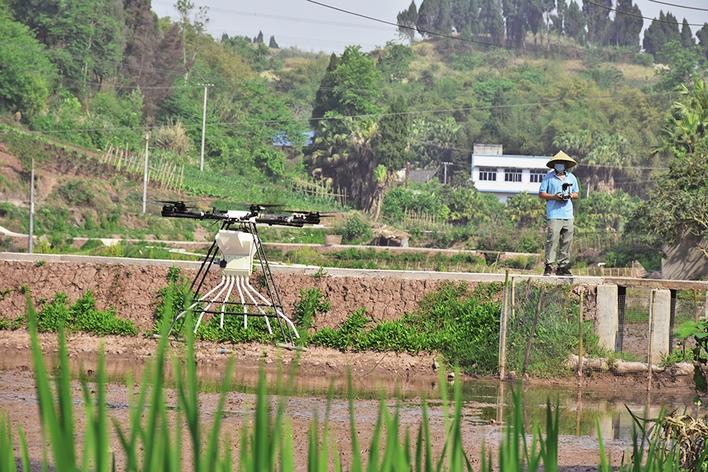 “五一”国际劳动节前夕,东兴区郭北镇林家观村一派热闹景象:满载新品水稻种的无人机挥“翱翔”在一块块稻田上空,上演“直播秀”,五分钟就能轻松“搞定”一亩田,吸引众多村民到现场观摩。