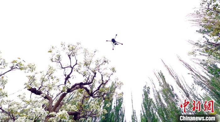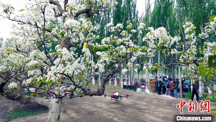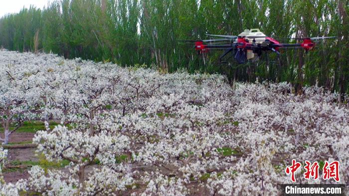 库尔勒市库尔楚园艺场已有4000多亩地采用无人机为梨花授粉。 甘明亮 摄