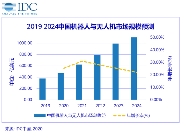 据IDC中国预测,疫情影响下,中国机器人与无人机市场规模将在2024年达到1211.2亿美元。