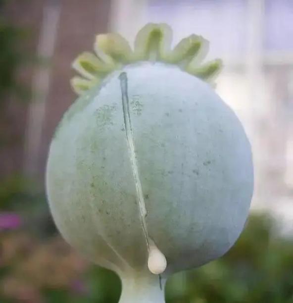 (被划破的蒴果,流出了白色的汁液,这些汁液干燥凝固后就是臭名昭著的鸦片)