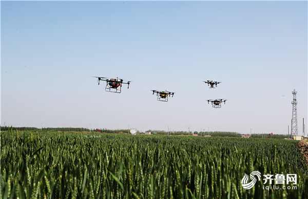 齐鲁网·闪电新闻5月7日讯 随着“嗡嗡嗡”的轰鸣声,在东营牛庄镇一处绿油油的麦田上,只见35架航空植保无人机旋翼转动、依次升空,药液均匀地喷洒在小麦叶片上……