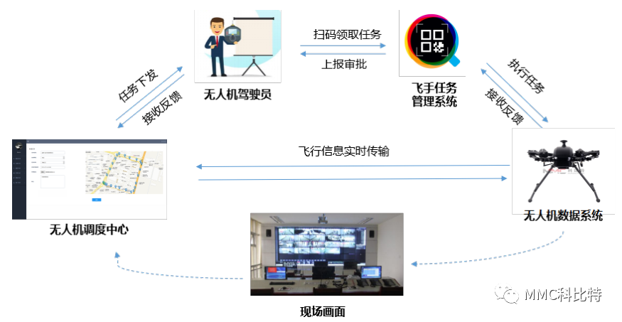 ①事故发生,指挥中心接警并通过调度中心派出无人机。