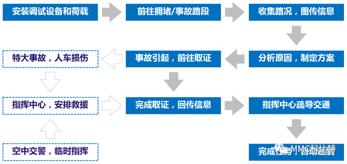当出现交通拥堵、堵塞状况时,通过无人机搭载可见光相机及喊话器模块快速抵达现场,高空侦察道路交通状况,实时回传到交警指挥中心,根据回传图像,指挥中心做出精准判断并通过喊话器远程指挥交通疏导。紧急情况下,无人机可以利用机载的交通信号灯、警报器等装备,担任空中电子警察,减少因事故造成的交通拥堵。
