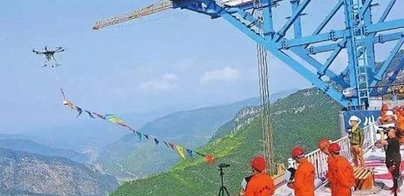 日前,赤水河特大桥建设现场上演了无人机“穿针引线”飞渡赤水的一幕,无人机牵2000米绳索,9分钟飞越赤水河。赤水河特大桥四川岸位于古蔺县太平镇,全长2009米,主塔高243.5米,相当于80多层楼,是世界上山区同类钢桁梁悬索桥中的第一高塔峡谷大桥。此次先导索采用直径2mm、长2000米的高强度高韧性韩国丝,由GPS自控导航式无人机携带,随着一声令下,飞手操控无人机从贵州岸243.5米高的塔顶起飞,飞跃1200米的赤水河峡谷,大约9分钟后到达四川岸228.5米的主塔塔顶,赤水河大桥两岸主墩索塔连为一体。