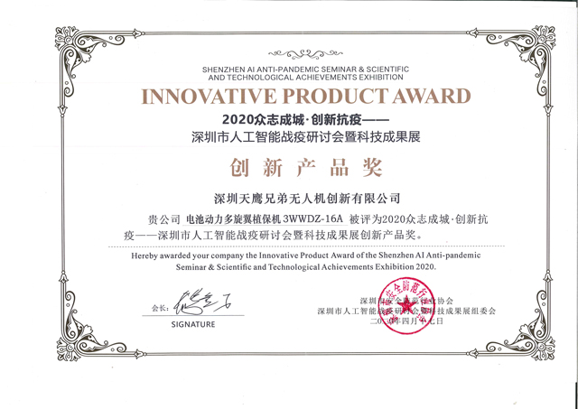 天鹰兄弟植保无人机M16凭借其抗疫情表现与可靠性能荣获2020众志成城·创新抗疫——深圳市人工智能战疫研讨会暨科技成果展“创新产品奖”。