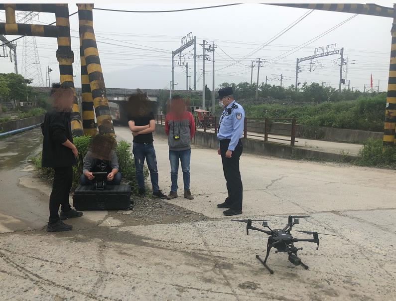 民警在涵洞旁发现4人正在操控上空盘旋的无人机,立即上前制止。经询问,4人称,因工作原因在这里放飞无人机。民警对他们的行为予以批评教育,告知他们,铁路电力线路都是上万伏的高压线,无人机靠近后容易受到高压强磁场影响,极有可能出现因信号被干扰后失控坠机,危及铁路运输安全。4人收回无人机,表示今后不再在铁路线边放飞。