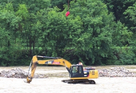 5月14日,慈利县金岩土家族乡三元村,被困河里的挖掘机。