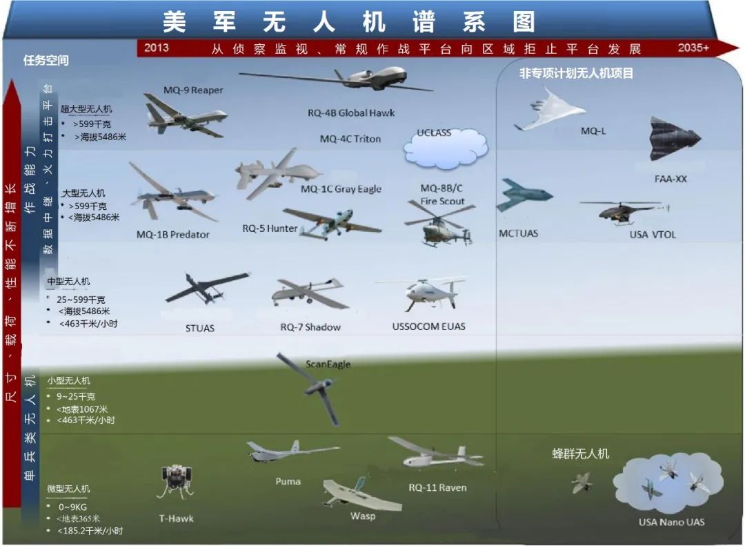 截至2014年1月,美国军方使用的无人机总数约为1万架,其中绝大多数是小型无人机,包括7362架“渡鸦”(Ravens)、990架“黄蜂”(Wasp)、1137架“美洲狮”(Puma)、306架“狼蛛鹰”(T-Hawks) (如图1)。