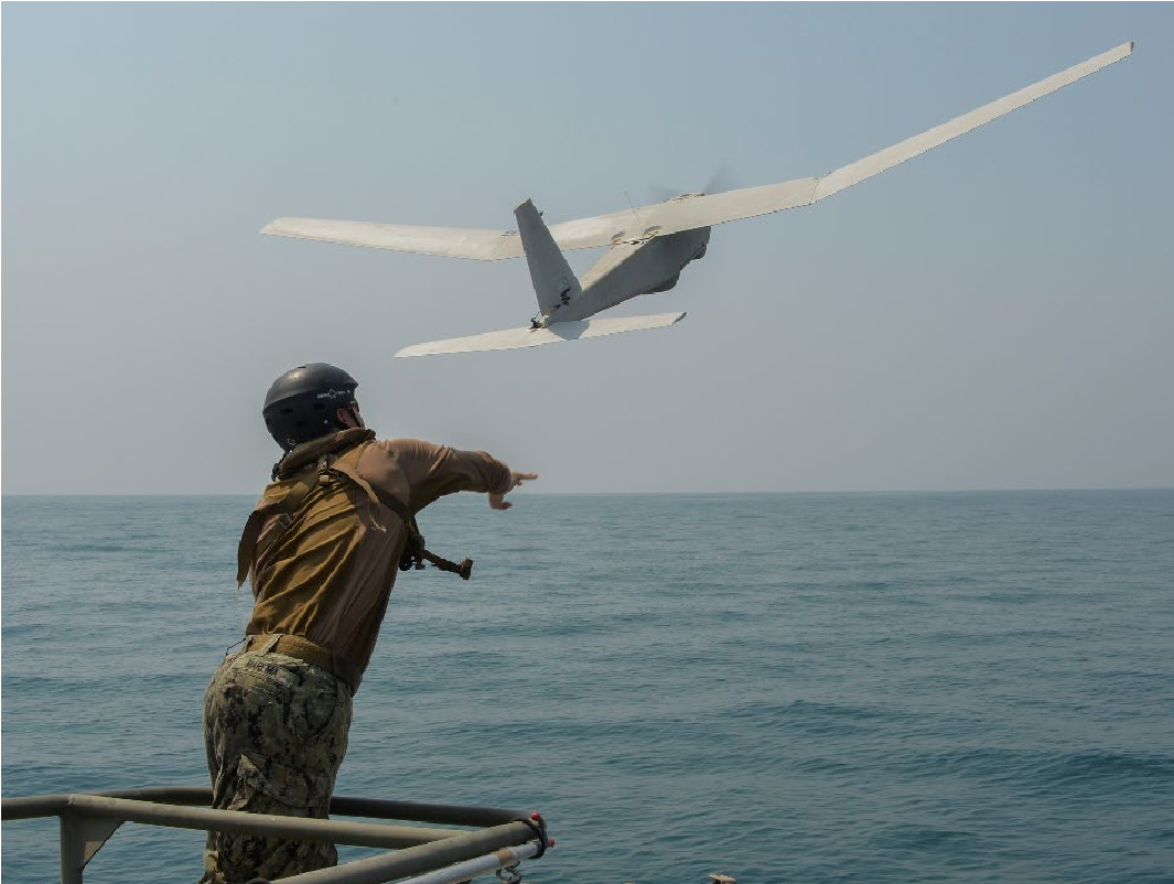 美国海军目前装备小型舰载战术无人机以执行侦察监视和武器运输,主要包括波音的“扫描鹰”(ScanEagle)和RQ-21A “黑杰克”(Blackjack),这两种舰载无人机都采用舰船弹射轨道起飞和天钩技术予以回收。