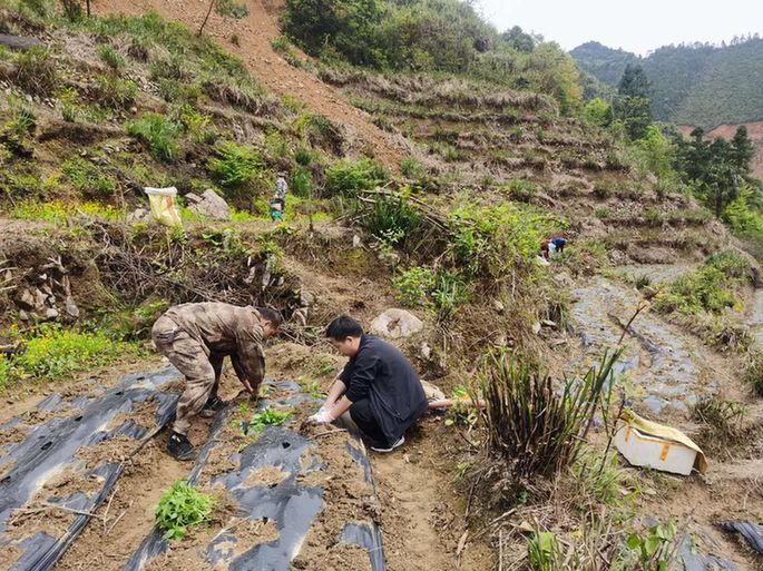 赵少辉深入农户,与其一同种植辣椒。(右一)