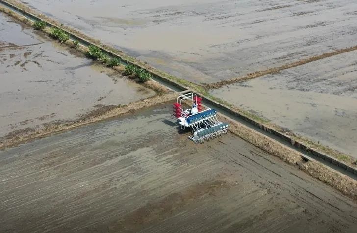 现场还演示了无人植保飞机在农业生产过程中的作业情况。在工作人员操控器遥控下,一架无人机正缓缓升起,围绕水田来回飞行。这款无人机除了能完成田间植保、洒农药,还实现了精量播种,能实现直播作业的智能化自动化播撒,可实现成行、成列,提升作业效率。