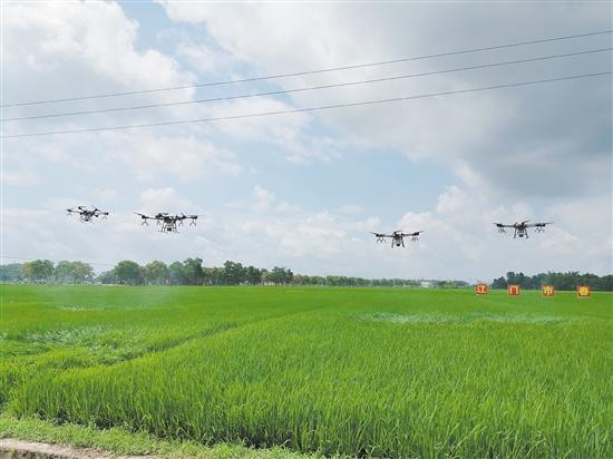 1台无人机飞防服务1小时可以施肥、喷洒药物超过百亩田,成为农业产业化的“标配”。近日,在恩平市牛江镇昌梅村国家级万亩水稻生产示范基地,近10台统防统治无人机集中起飞,为春耕生产及水稻病虫害统防统治提供助力。当天,江门市春耕生产现场会暨水稻病虫害统防统治推进会在牛江镇举行,现场会用科技手段加强统防统治效果,为春耕生产保驾护航。