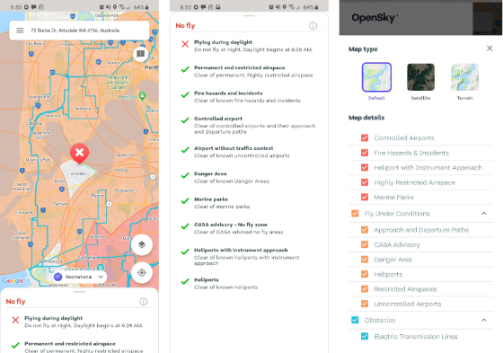 对于正常的飞行区域和机场区域,您可以下载应用程序以检查是否适合在特定位置飞行。为此,我们建议使用由Wing Aviation和CASA创建的OpenSky。输入任何位置,然后确切告诉您有关任何限制的信息。