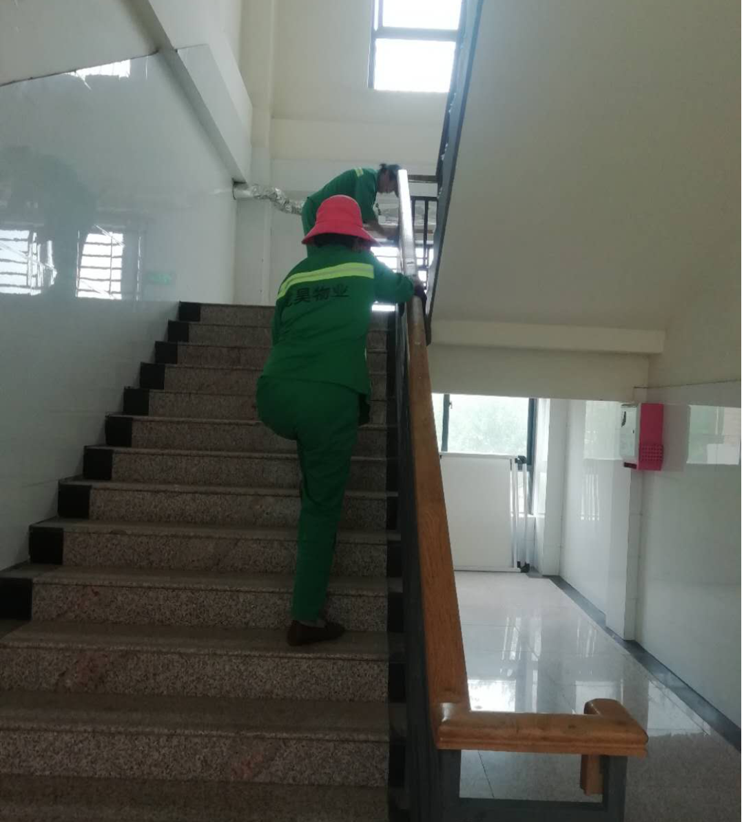 物业保洁人员对教室内进行全面的打扫、消杀