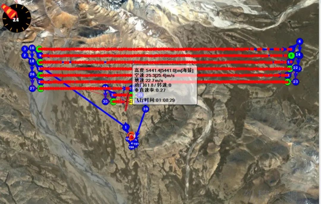 任务中,CW-15纵横大鹏无人机搭载总像素1.2亿的半画幅倾斜相机,起飞海拔4300米,飞行海拔5441米,相对航高1141米,飞行1个架次,完成该矿区航测任务。