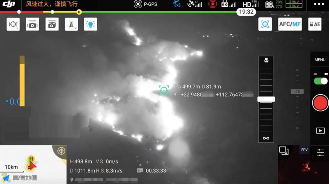 通过禅思 H20T 相机的红外热成像画面,消防指战员有效地突破了烟雾及夜色封锁,迅速获知火场整体信息。在打点定位功能的支持下,无人机帮助消防指战员精准定位着火点位置,为高效制定扑救方案提供重要帮助。