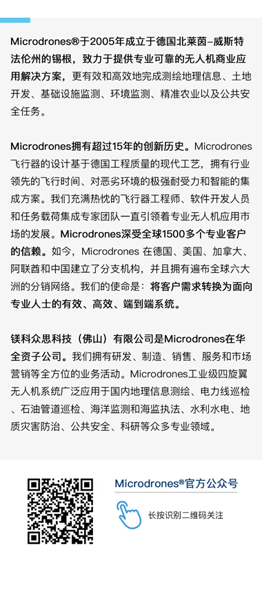 Microdrones拥有超过15年的创新历史。Microdrones飞行器的设计基于德国工程质量的现代工艺,拥有行业领先的飞行时间、对恶劣环境的极强耐受力和智能的集成方案。我们充满热忱的飞行器工程师、软件开发人员和任务载荷集成专家团队一直引领着专业无人机应用市场的发展。Microdrones深受全球1500多个专业客户的信赖。如今,我们在德国、美国、加拿大、阿联酋和中国建立了分支机构,并且拥有遍布全球六大洲的分销网络。我们的使命是:将客户需求转换为面向专业人士的有效、高效、端到端系统。
