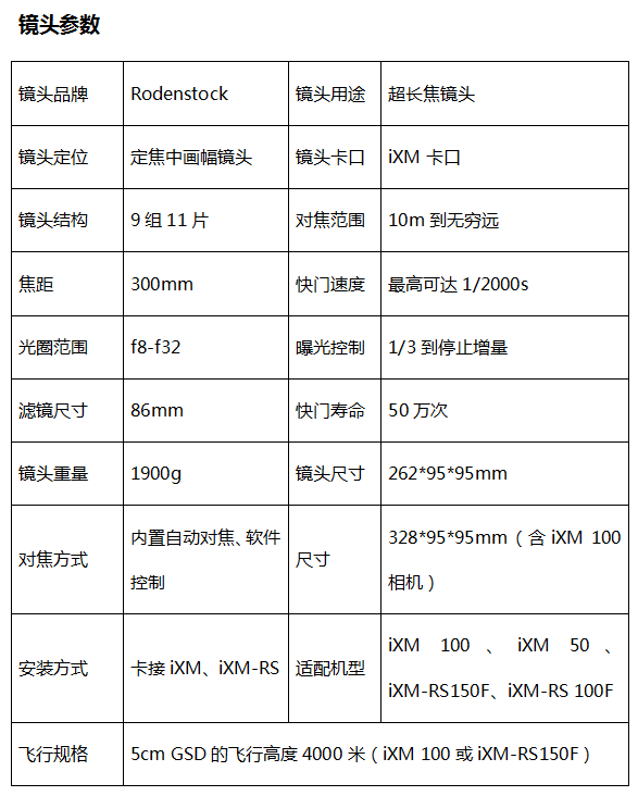 RSM 300mm AF f/8镜头是目前Phase One公司出品的焦距最长的工业航拍镜头,搭配iXM 100或iXM-RS150F使用时,5cmGSD的飞行高度为4000米。