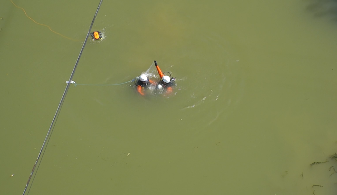 另一名已经沉入河底,水下无人机搜寻,蓝天救援队蛙人潜水救援。