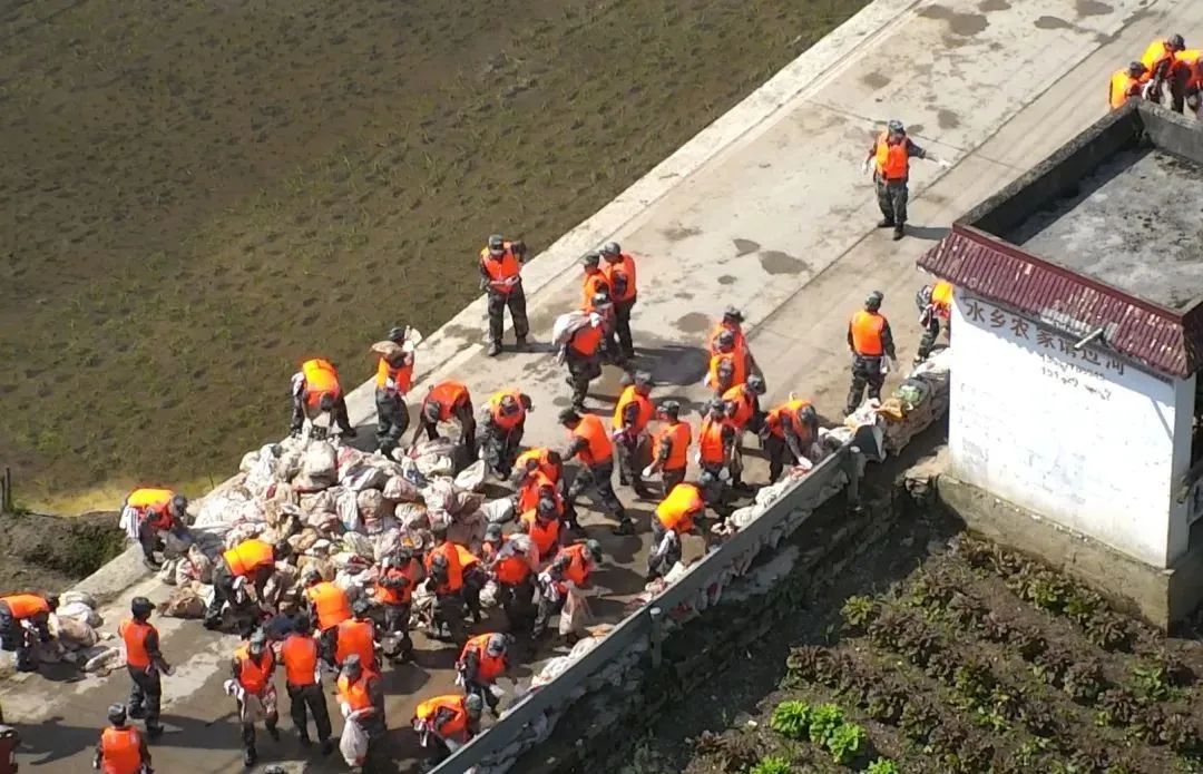 人员疏散及抢救完成,民兵队入场加固河堤,防止泄洪事故发生。