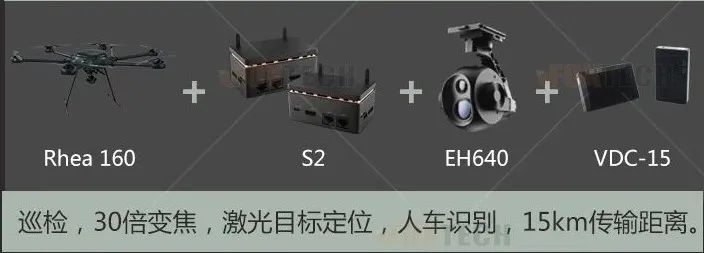 除此之外,还有无人机挂载30倍变焦云台EH640套装,配备VDC-15远传视频传输系统,传输距离15km,可人车识别,可应用于巡检当中。