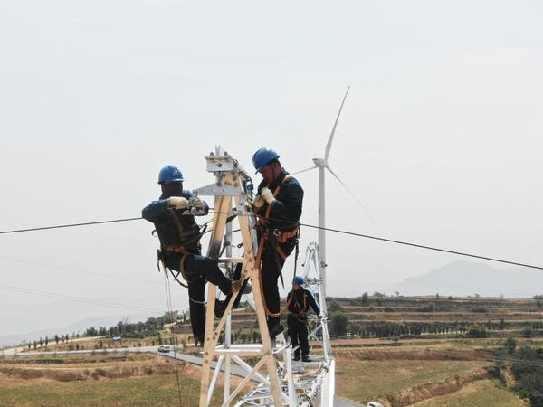 6月5日,在三门峡高庙乡羊虎山上,国网三门峡供电公司20余名员工正对220千伏三虢线进行紧急消缺,为迎峰度夏把好电网安全质量关夯实坚实基础。