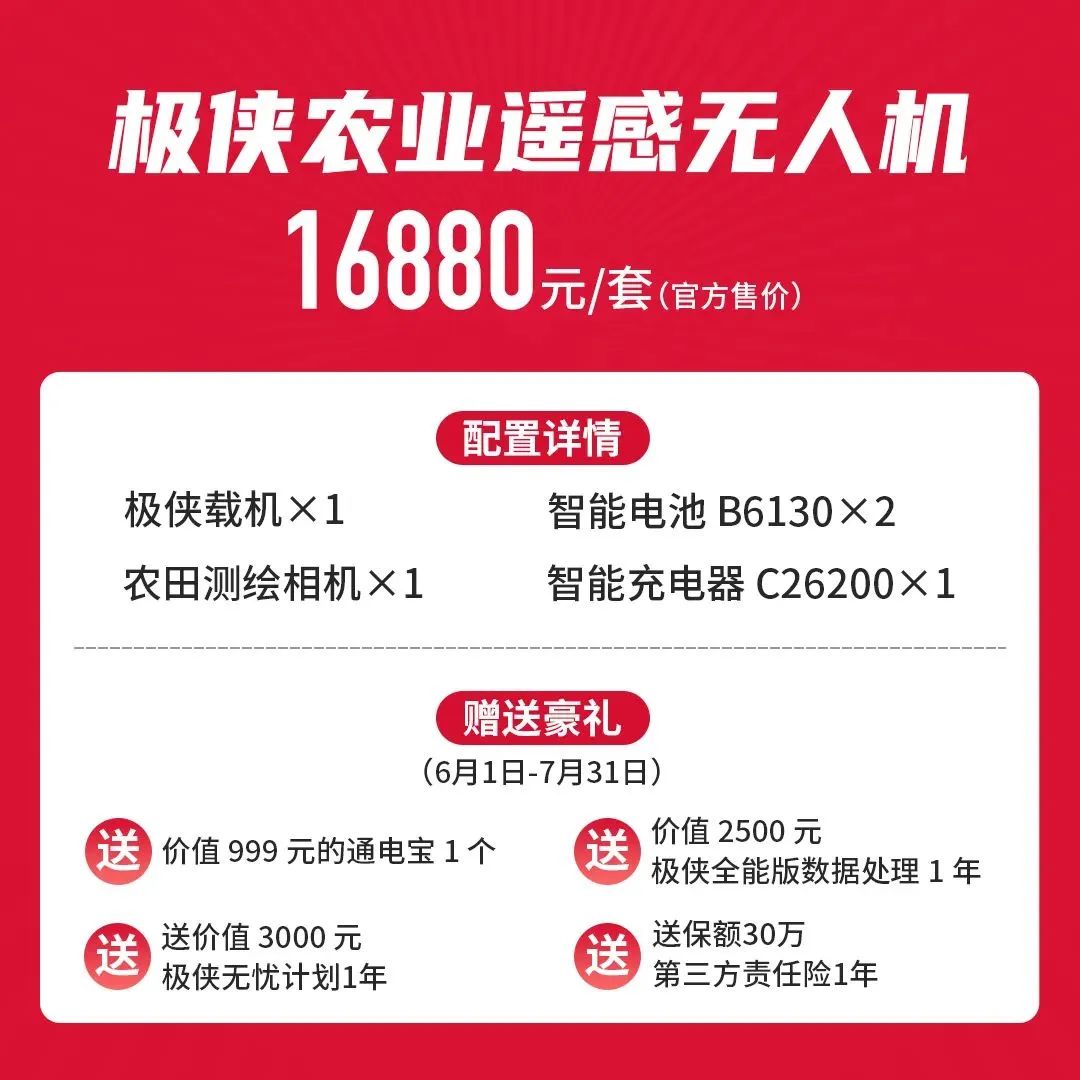 该优惠套装包含极侠载机、农田测绘相机、电池及充电器,用户在6 月 1 日- 7 月 31 日期间购买,将免费获得通电宝(可实现 P 系列智能电池向极侠电池充电)、极侠全能版数据处理服务、极侠无忧计划和第三方责任险。套装详情如下: