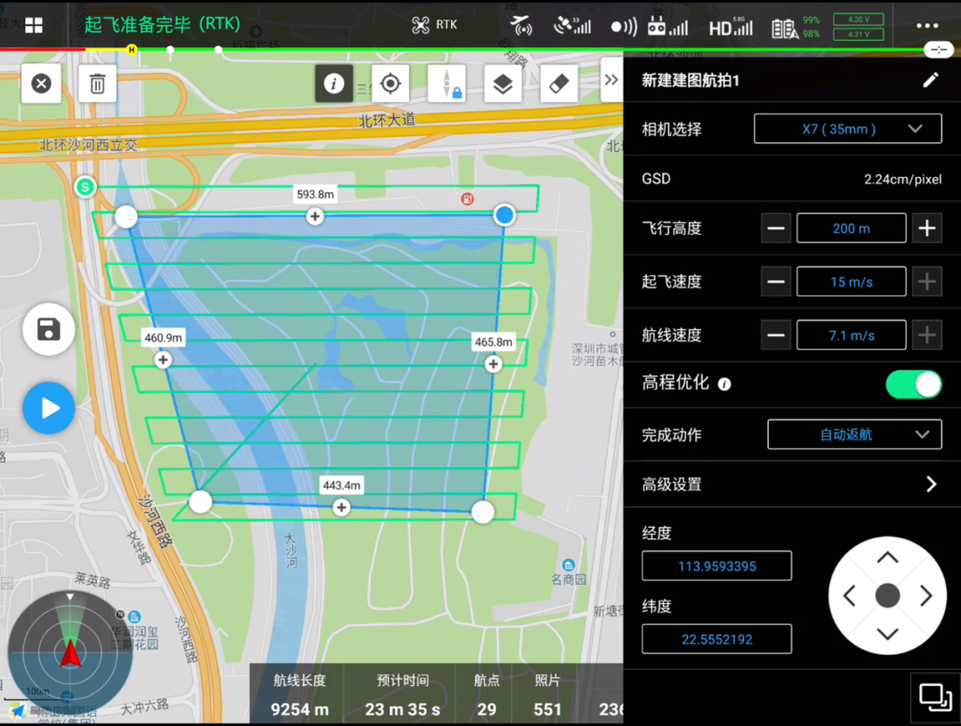 通过经纬 M210 RTK V2 + 禅思 X7 云台相机进行测绘航拍时,如果只拍摄一组正射影像用于模型重建,所得到的三维模型的高程精度可能不够理想。开启高程优化功能后,无人机在完成正射影像采集后,还会自动从航线结束点飞行至测区中心并拍摄约 10 张倾斜航片,可以与正射的航片一起导入大疆智图进行模型重建。