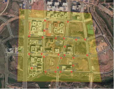 本次试验测区位于四川省成都市某地区,场地内地势较为平坦,多为高层建筑,其中最高建筑物高约50米,其余为道路及未修建的平地,地形高差在10米以内。实验当天,无人机飞行时间为下午13点~14点45分,在该时间段内,天气为晴天,场地内光线适中,1~2级微风,适合飞行。场地内共布设25个地面检查点,其分布如下图所示,点位清晰易辨认,用于本次实验的精度验证。