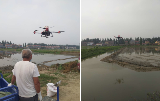 6月8日下午,在张家窑办事处湖嘴队虾稻共作田上面,一台无人机边飞边播撒着稻种。仅3小时便完成了100亩稻田的播种工作。这是张家窑办事处首次借助无人机播种,新奇高效的播种方式引起了当地村民的阵阵惊叹。