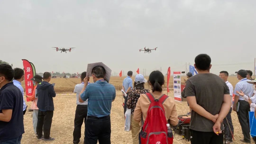 活动现场,两架极飞农业无人机在麦田上空按照既定航线起飞,进行全自主喷洒演示