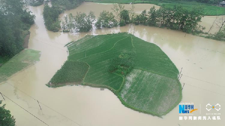 这是无人机6月13日拍摄的重庆市酉阳土家族苗族自治县涂市镇部分农田被淹,最深处达到1米。新华网发(陈碧生 摄)