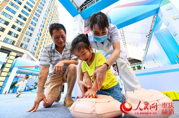 市民学习体验心肺复苏项目。重庆市应急管理局供图