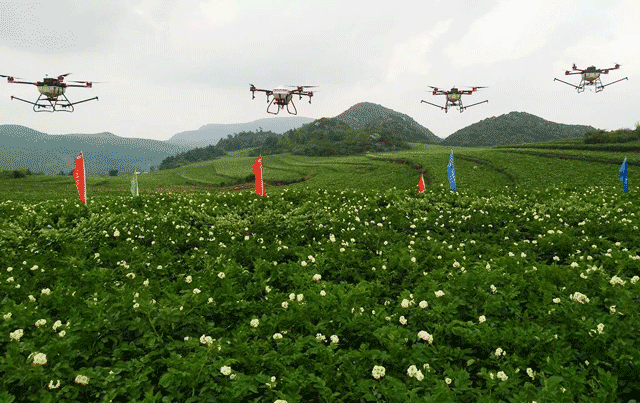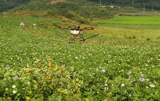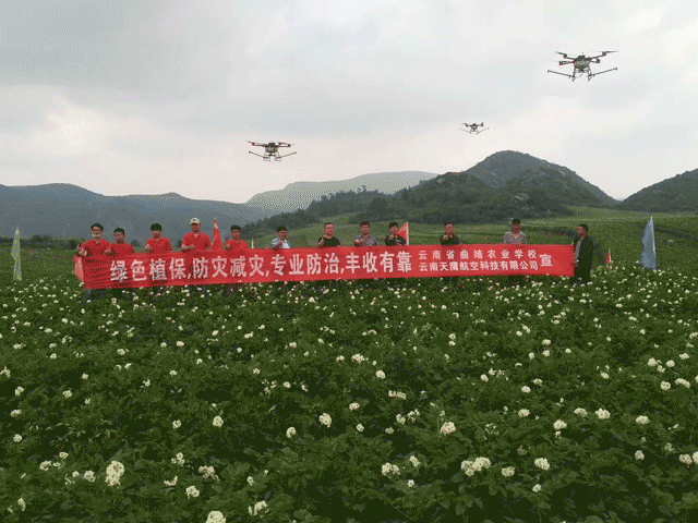 眼下,正是马铃薯产量形成的关键时期,然而,受连续高温高湿天气影响,马铃薯进入晚疫病爆发高峰期。为有效防控马铃薯晚疫病危害,促进农业增效,农民增收,宣威市双河乡大桥村村级带贫合作社采用购买天鹰兄弟飞防服务的方式,利用植保无人机对大水塘村500余亩马铃薯进行统防统治。