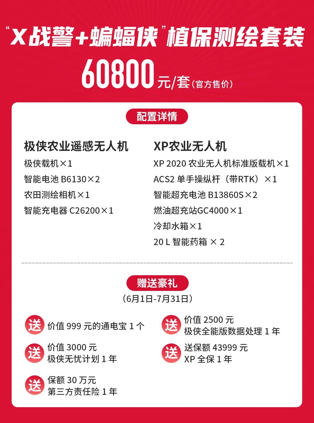 优惠套装包含极侠载机、农田测绘相机、电池及充电器,用户在 6 月 1 日- 7 月 31 日期间购买,将免费获得通电宝(可实现 P 系列智能电池向极侠电池充电)、极侠全能版数据处理服务、极侠无忧计划和第三方责任险。套装详情如下: