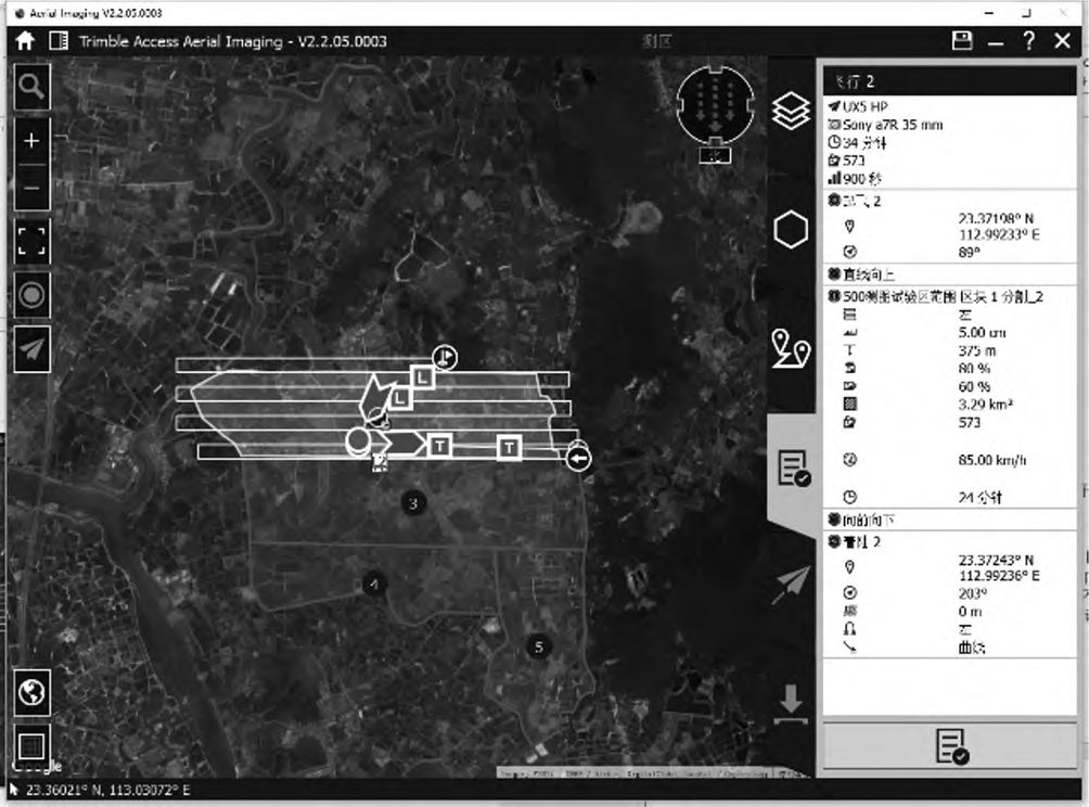 UX5HP 飞行航线设计利用Aerial Imaging 软件完成; 为满足测图精度要求,提高飞行效率,本次航线设计采用索尼a7R II 相机35 mm镜头,航向重叠度设计为80%,旁向重叠度设计为80%,地面分辨率设计为5 cm,航高设计375 m,如图4 所示。