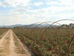 沿着预设轨道在玫瑰花田上空喷洒农药