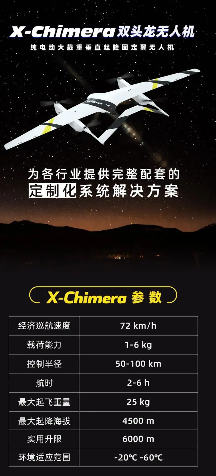 傲势X-Chimera双头龙无人机作为纯电动垂直起降固定翼无人机,拥有续航时间长,负载重量大的特点。搭载航测相机航时可达5.5小时,搭载光电吊舱航时可达4.5小时,搭载1350测程激光雷达航时可达2小时;最大起飞重量25Kg,载荷可达6Kg……用优异的性能优势满足各行业应用需求。