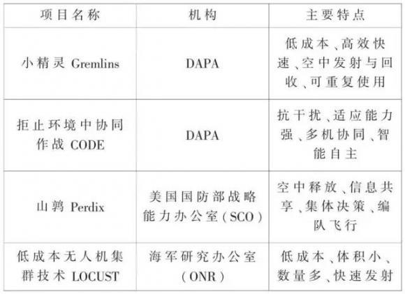 通过单体之间的紧密协作,体现智能无人机集群体作战性能的优越性,世界各国均致力开展智能无人机集群的研究,已经成为无人机领域的一个重要发展方向。美国通过国防高级研究局 (Defense Advanced Research Projects Agency, DARPA)和海军研究实验室(United States Naval Research Laboratory, NRL)等机构全力探究无人机集群最新技术,应用于军事发展,以保证其全球军事技术领先。目前典型的无人机集群技术有:小精灵(Gremlins)项目、拒止环境中协同作战项目(CODE)、“山鹑”(Perdix)微型无人机项目、低成本无人机集群技术项目(LOCUST)等。