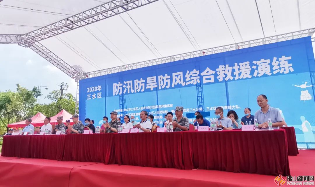 本次演练由区三防指挥部主办,区人民武装部、区应急管理局、区卫生健康局、区司法局、区公安分局、区消防救援大队、区气象局、云东海街道办事处等单位参演。佛山军分区司令员龚晓晖,三水区长、区三防指挥部总指挥胡学骏,区委常委、区武装部政委齐智,区三防指挥部成员单位以及各镇(街)有关领导共60余人出席活动。