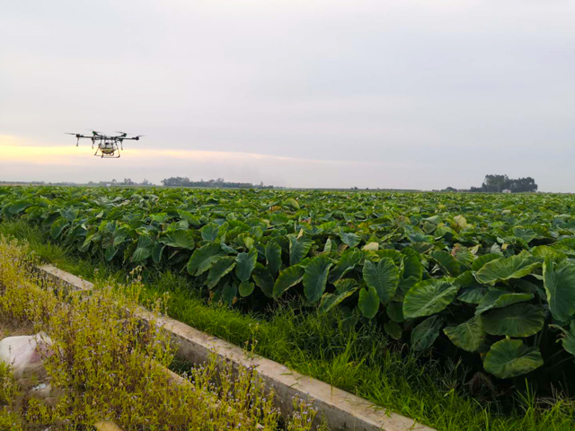 芋头田间,在飞手的操控下,一架六旋翼天鹰兄弟植保无人机X25正在距离芋头上方进行平稳飞行,喷洒药液穿透性强,均匀渗透作物的底部。据现场负责人表示,芋头叶面大,人工喷洒效率低,还会出现重喷漏喷现象,而利用植保无人机节省时间,提高效率,操作人员只要通过地面操作就可实现喷洒药剂、种子、粉剂等。防止人体近距离接触农药而中毒,特别是高温季节,保证人体安全。