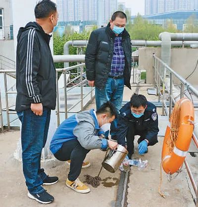 济南的禁毒民警、禁毒社工在现场采集污水样品。贾卫国摄