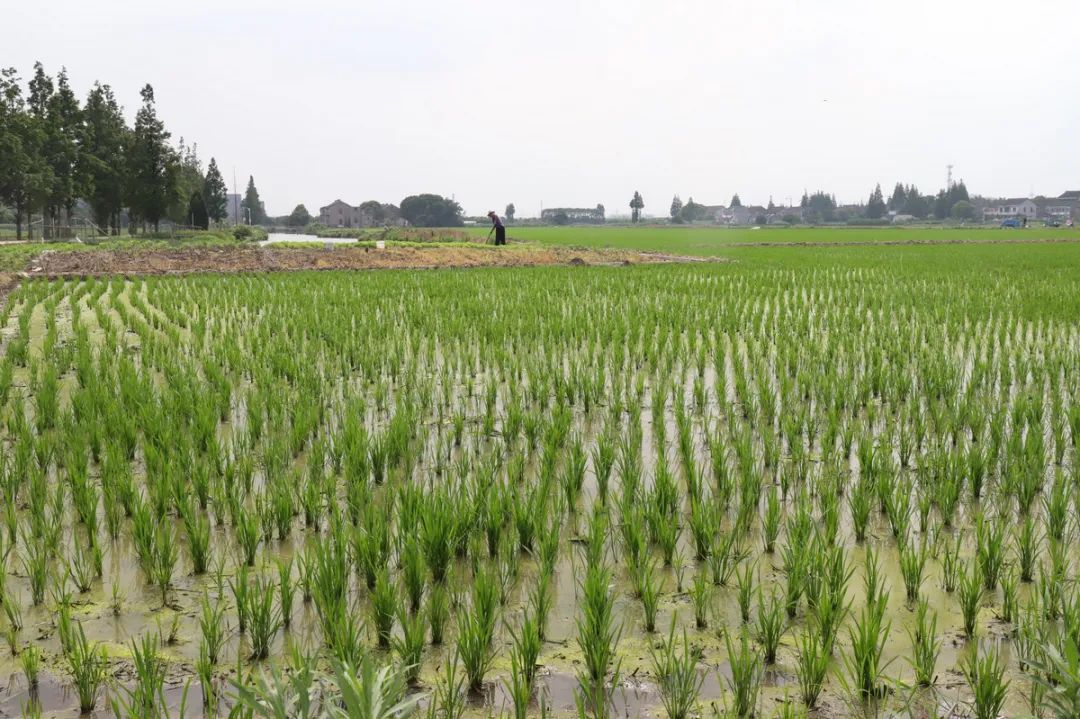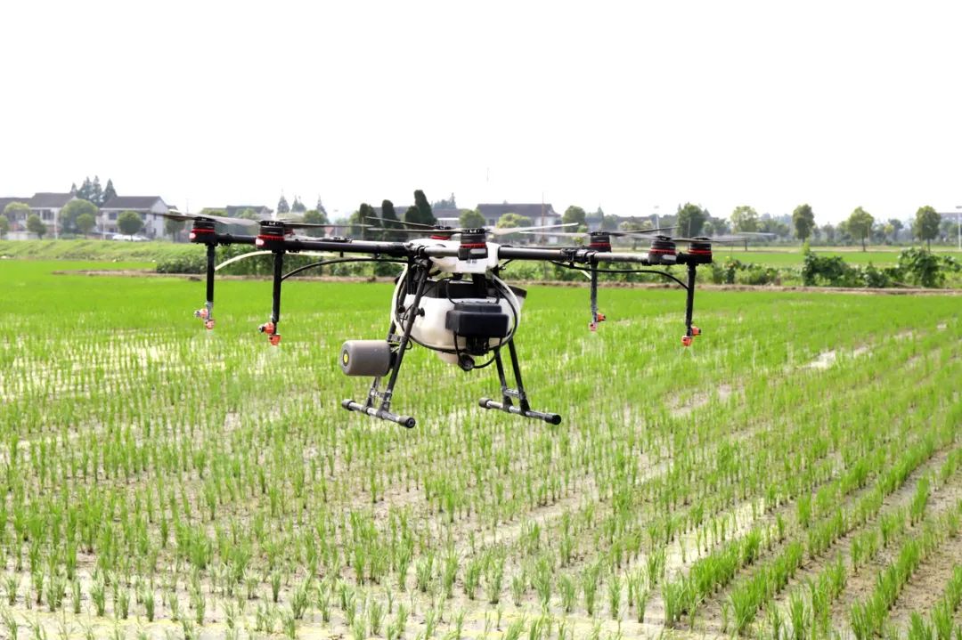 秧苗已经长得郁郁葱葱,植保无人机缓缓飞起,开始喷洒药物,所过之处稻叶翻腾……