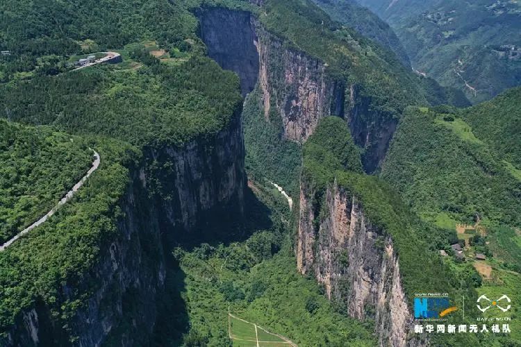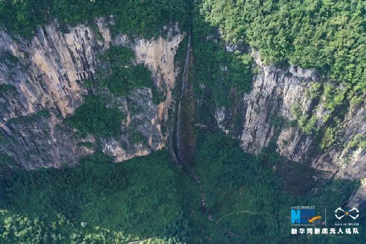 这是在“山门”正上方拍摄的画面,绝壁顶部植被茂盛,郁郁葱葱。(无人机拍摄) 新华网 向进 摄