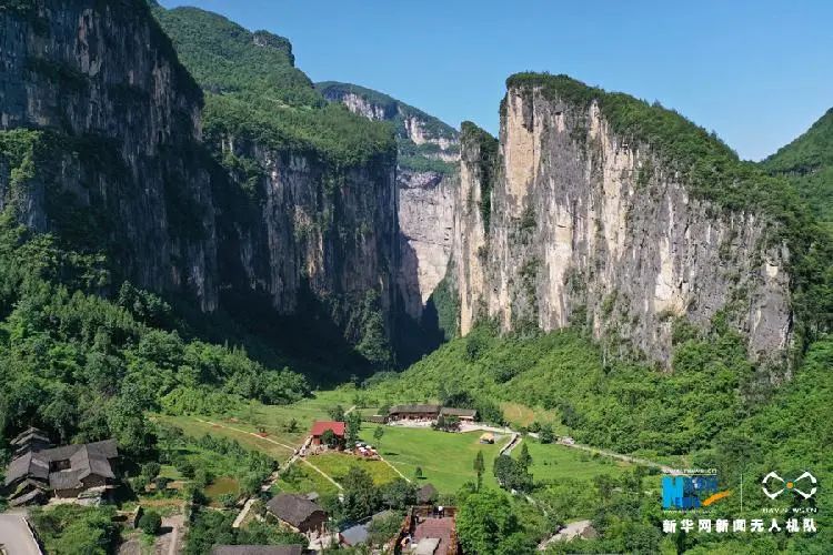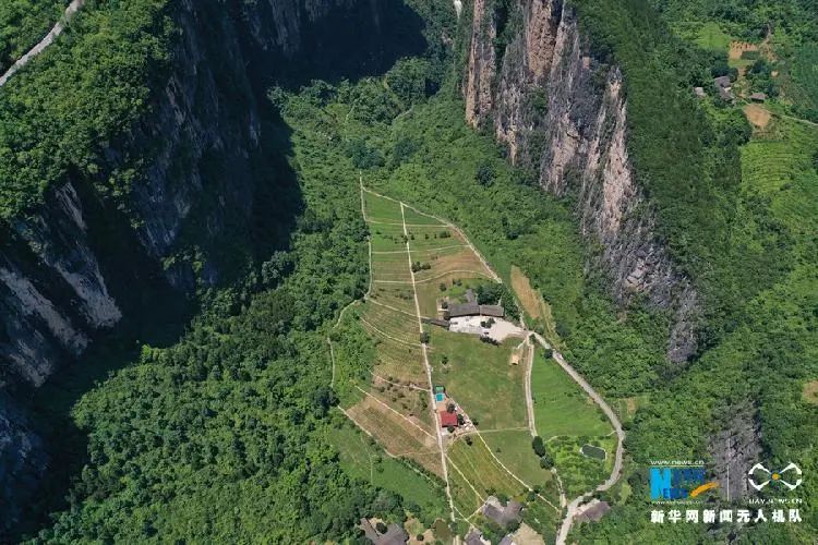 “山门”与周边绝壁共同构成了一座巨大天坑。(无人机拍摄) 新华网 向进 摄