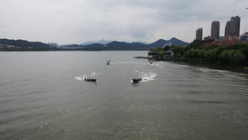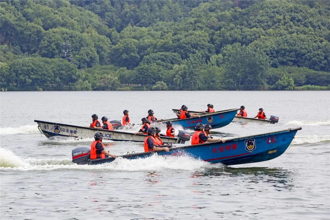 特警冲锋舟和快艇在水上编队行进