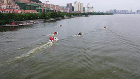 在磁湖仁智山水码头,50名特警防汛队员和4艘冲锋舟、1艘快艇、1架无人机等防汛装备,分别开展了一字队型、正梯队形、反三角队形、护航队形等水上编队、队形变换、换速前进和群众溺水救援、无人机空投救生圈以及水上贩卖毒品、投掷爆炸物等突发事件处置演练。