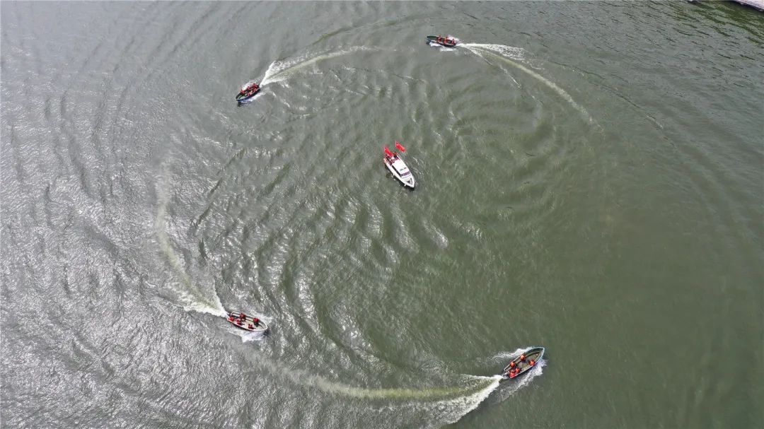 特警冲锋舟和快艇根据旗手的旗语指示,成一字队形、梯形、三角等队形编队行进。结合水域环境和任务的不同来迅速调整队形,快速变换,展示了队员们熟练的驾驶技术。