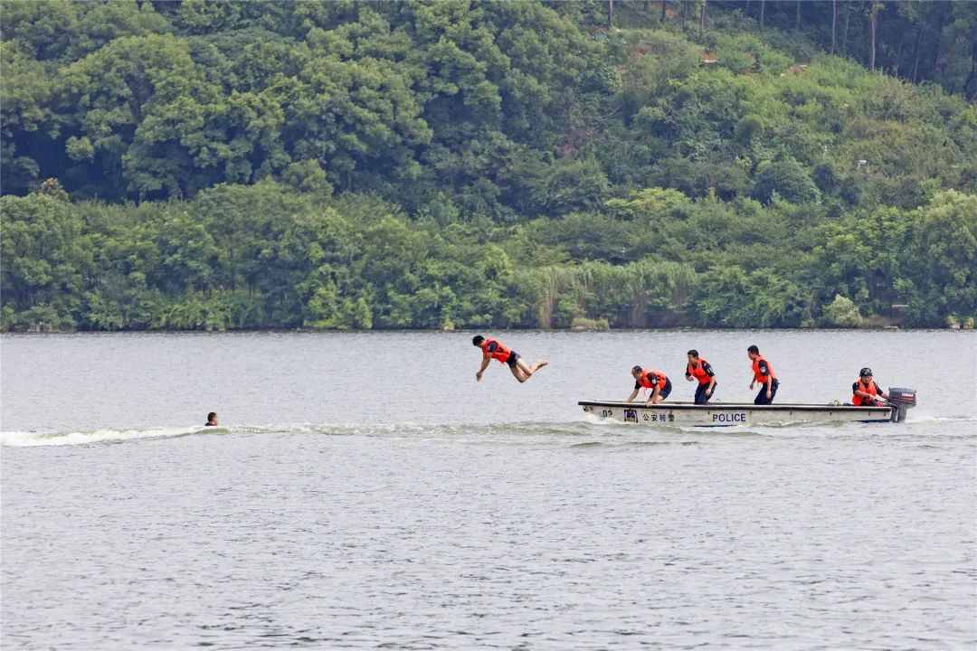 演练科目模拟一游船发生故障,两名游客落水。特警队员迅速出动